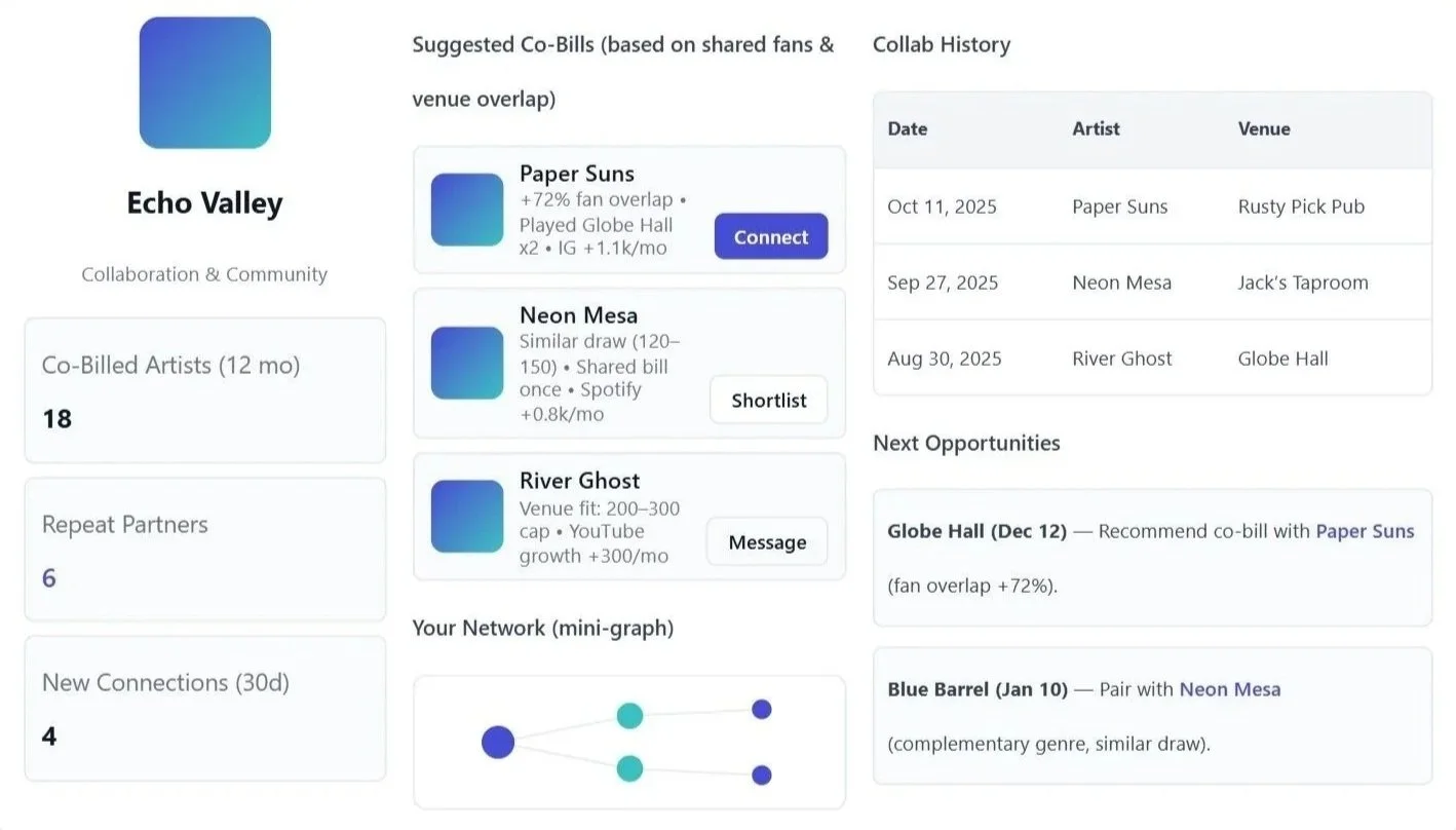 Find co-billed artists, track who you’ve played with, and connect for future opportunities.