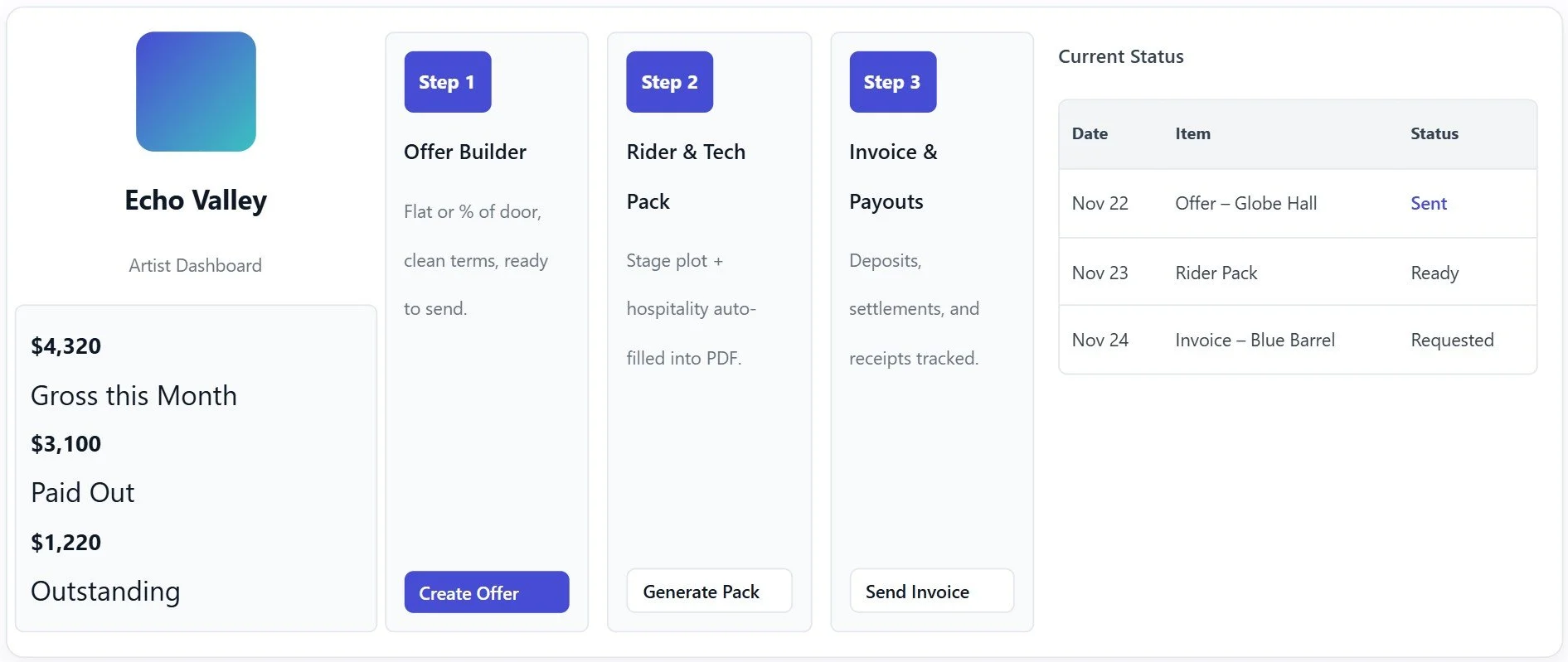 We auto-generate a profile for every Denver artist with your music, bio, highlight tracks, and live history, all in one place for fans and bookers.