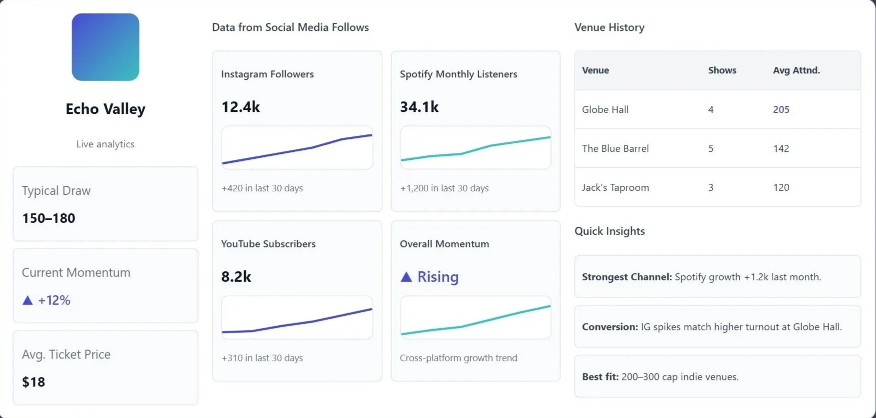 See your typical draw, momentum, and venue history. Learn what’s working and how to grow.
